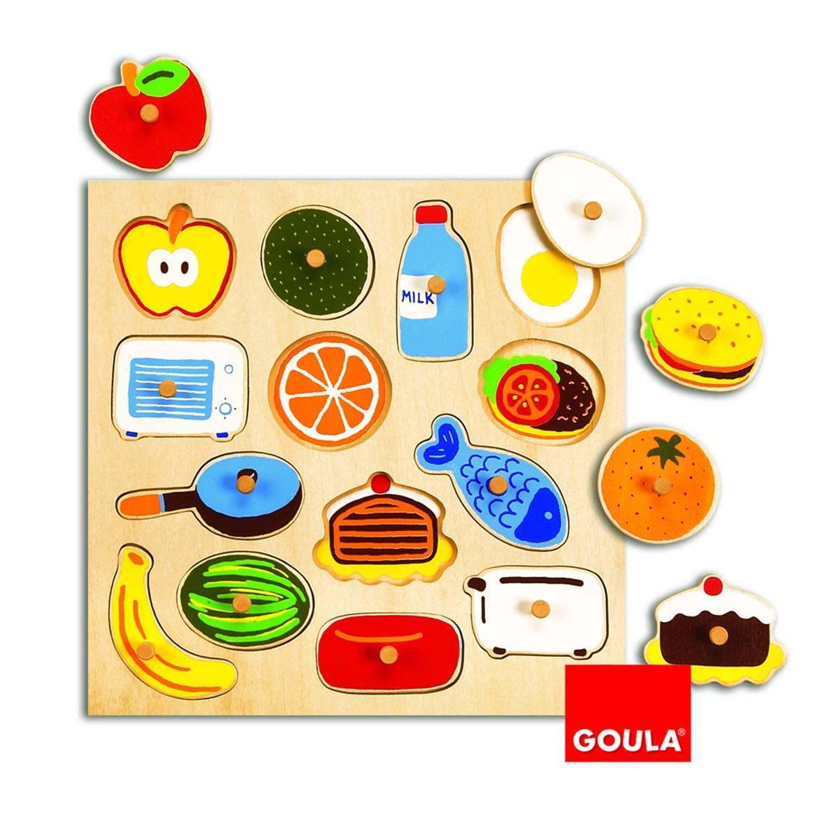 14種食物拼圖,顏色鮮艷,底部設計產品圖片, 有助教導孩子概念學習。認知顏色,讓孩子更容易認識生活周遭事物, 輕鬆無負擔學習。把手的設計有助於幫助提高小孩子的動手能力。